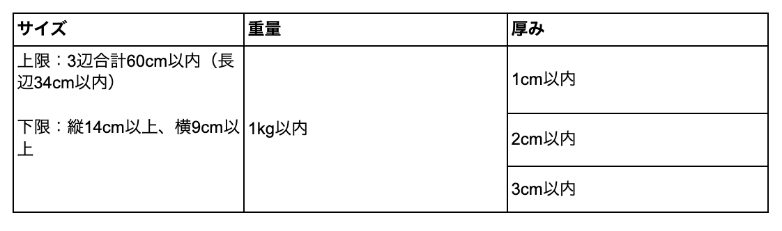 厚さごとの全国一律料金で、遠方でも追加料金なし。小型商品の発送コストを抑えたい事業者に適しています。