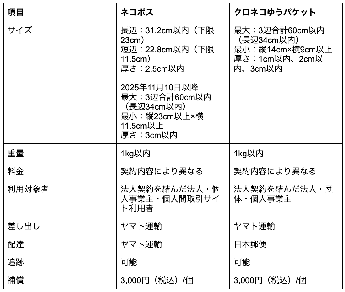また、2025年11月10日からネコポスの取扱いサイズが拡大し、置き配サービスに対応することが告知されています(2025年10月時点)。
