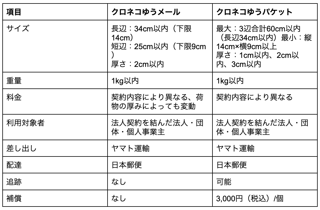 クロネコゆうパケット同様、クロネコゆうメールはヤマト運輸と日本郵便の協業サービスで、主に書類や冊子などの発送に使われます。クロネコゆうパケットとの違いは以下の通りです。